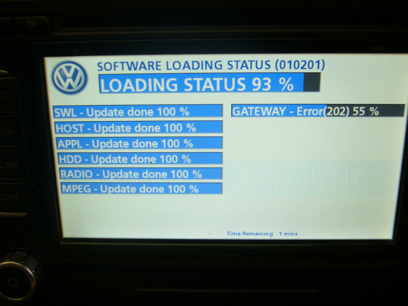 #2 | RE: VW 1T0 035 680 B stürzt bei SW-Update ab bei Gateway 55% => Meldung Error 202 datum05.04.2013 10:00 (zuletzt bearbeitet: 05.04.2013 10:01)